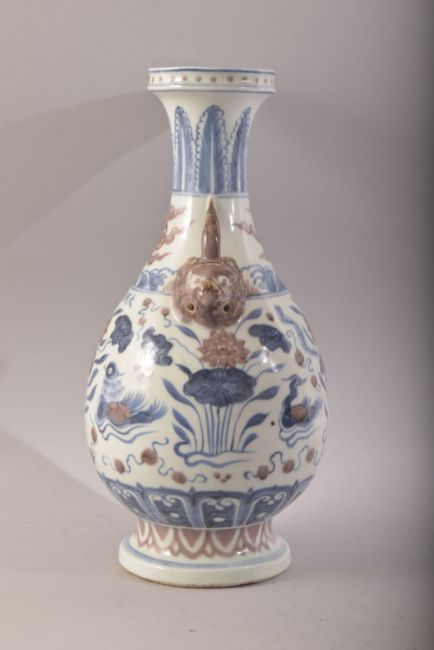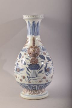 A CHINESE BLUE, WHITE & IRON RED TWIN HANDLE PORCELAIN VASE - th body decorated with duck and lotus, with moulded mask handles - with a six character mark to front 32cm