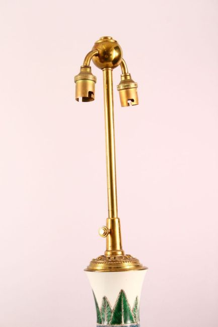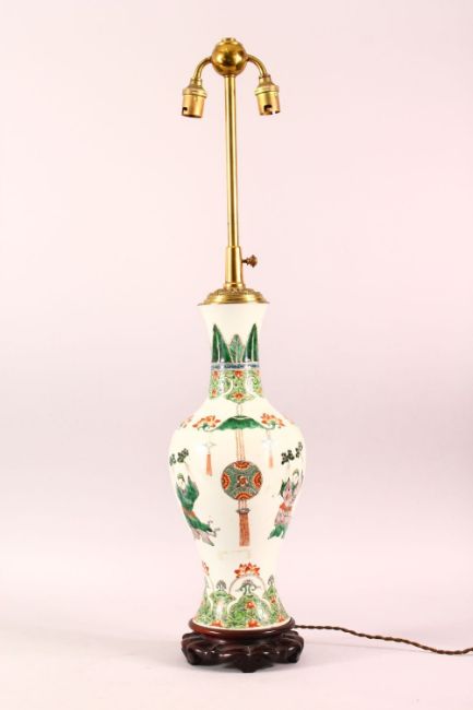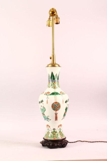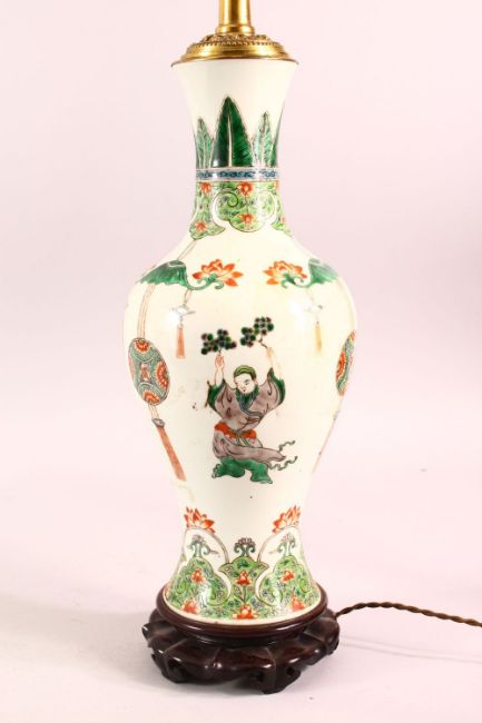 A GOOD CHINESE FAMILLE VERTE PORCELAIN LAMP / VASE, the vase painted with figures and floral motifs, includes shade with similar painted figures and motifs, overall height 67cm.