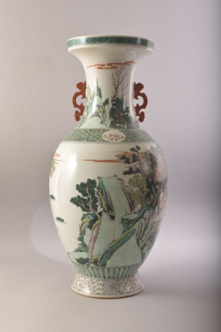 A LARGE CHINESE FAMILLE VERTE TWIN HANDLE PORCELAIN VASE, depicting a landscape scene with a horse and cart, figures in a building and a mountainous landscape on the neck, 60.5cm high.