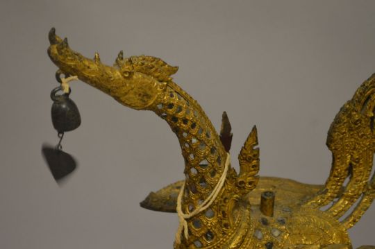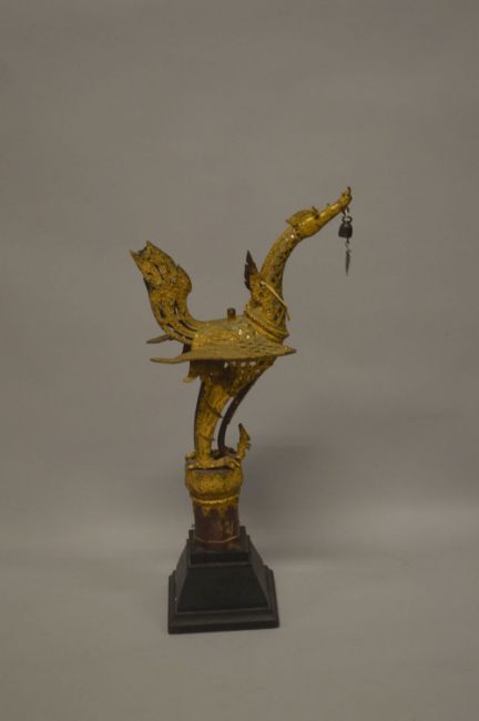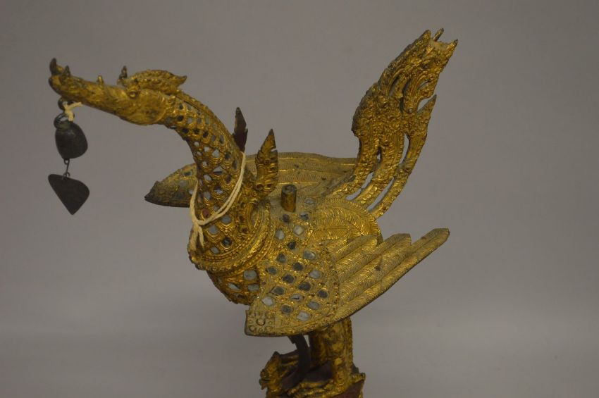A 19TH CENTURY BUDDHIST GILT BRONZE FIGURE OF A HONGSA BIRD, inlaid with mirrored pieces, the mouth fitted with a hanging bell, fitted to a wooden base, 84cm high.
