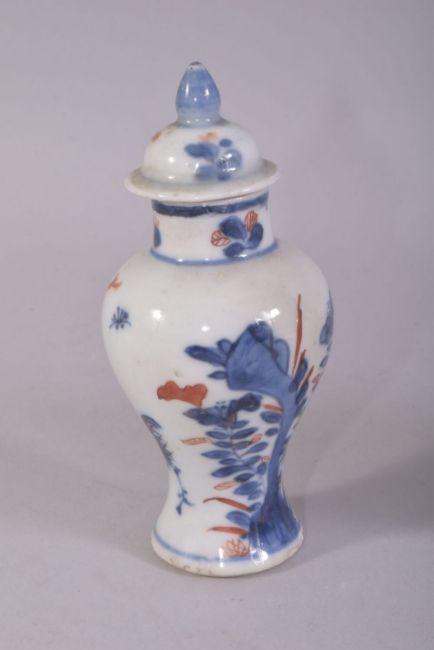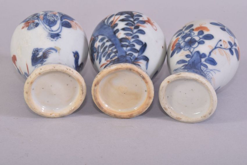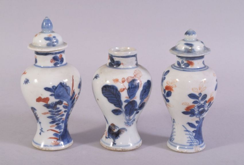 THREE SMALL IMARI PORCELAIN VASES with two covers, tallest 12.5cm (overall).