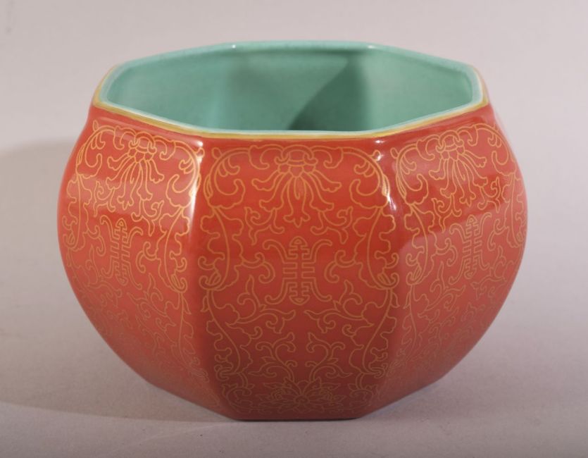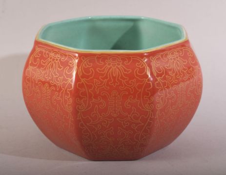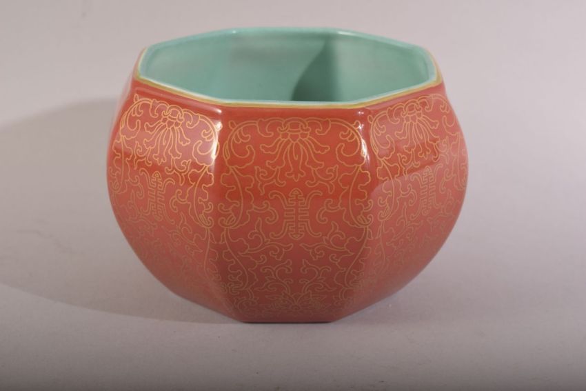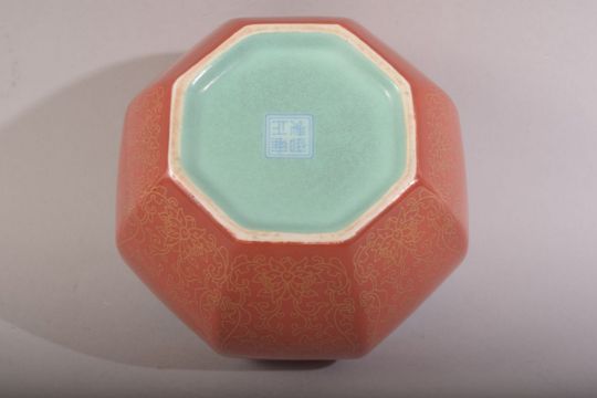 A CHINESE CORAL RED & TURQUOISE PORCELAIN BOWL - the interior with a turquoise glaze, the body with gilded decoration - the underside with a four character mark 12cm