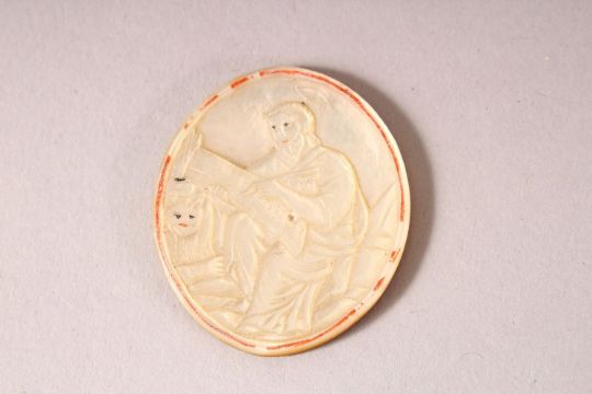 FIVE SMALL 18TH/19TH CENTURY JERUSALEM CARVED MOTHER OF PEARL OVAL PANELS, each depicting figures carrying out various tasks, largest 4.5cm x 4cm.