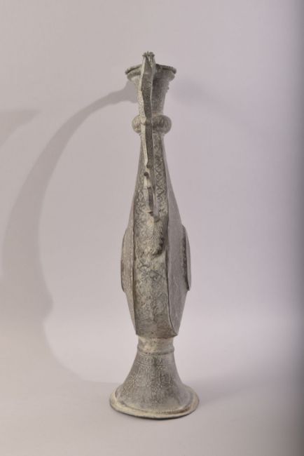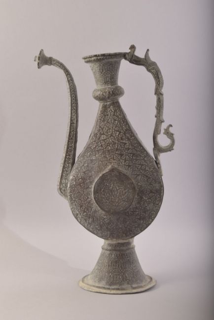 A LARGE INDIAN TINNED COPPER EWER, with embossed and chased decoration all over, flower headed spout and zoomorphic handle, 46cm high.