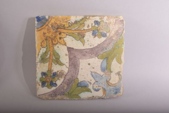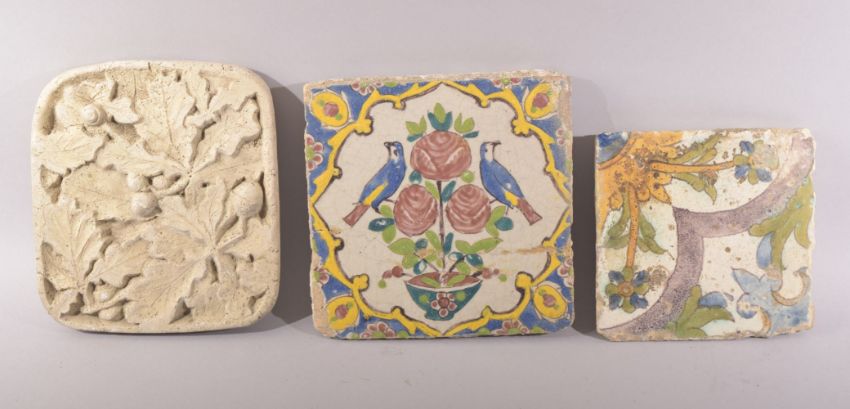 TWO PERSIAN GLAZED POTTERY TILES, together with another tile with relief decoration, signed to verso, largest 18cm square (3).
