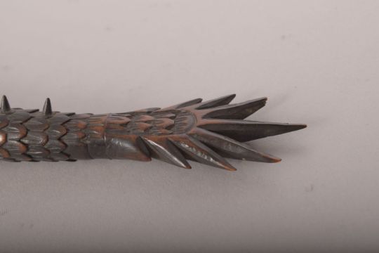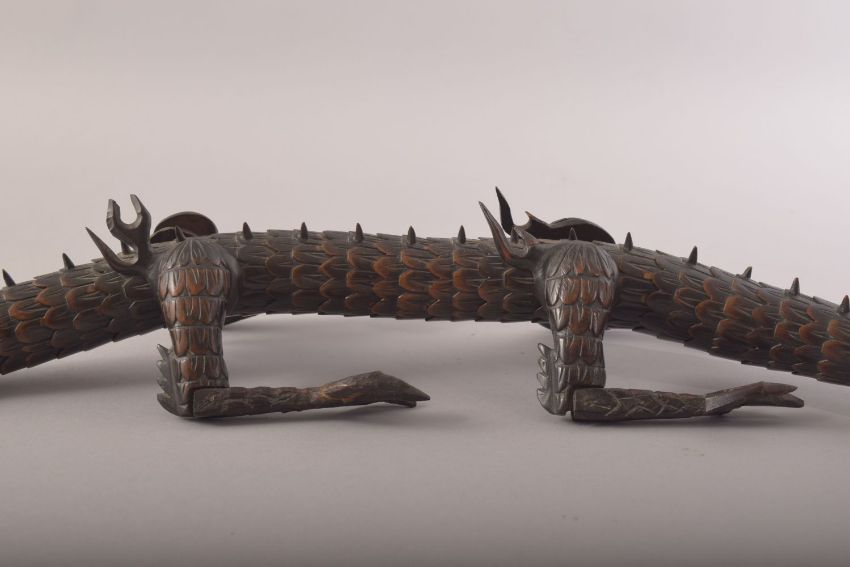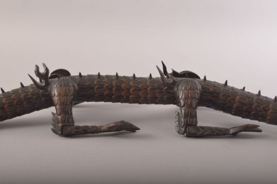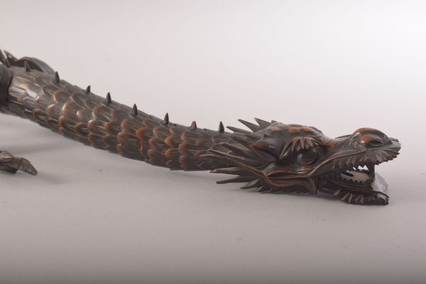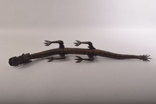 A SUPERB JAPANESE BOXWOOD RETICULATED MODEL OF A DRAGON, standing on four carved legs with a reticulated body from neck to tail, measuring 60cm long.