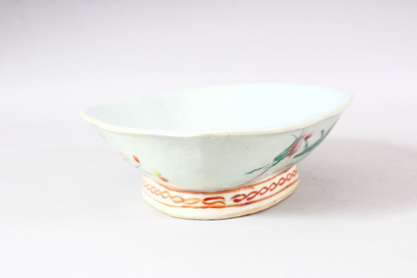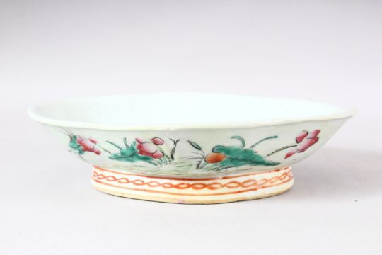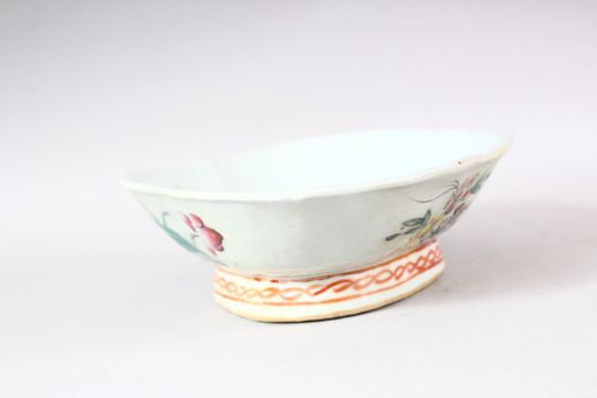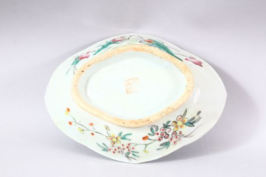 A 19TH CENTURY CHINESE FAMILLE ROSE PORCELAIN DISH - of elongated form, the exterior with decoration depicting lotus and flora, the underside with an iron red seal mark, 25.5cm wide