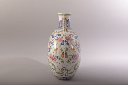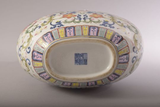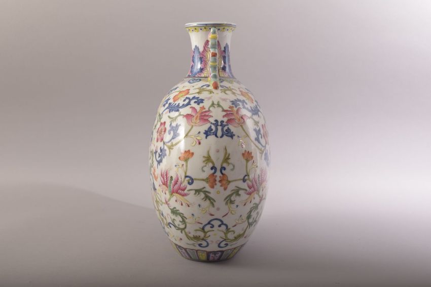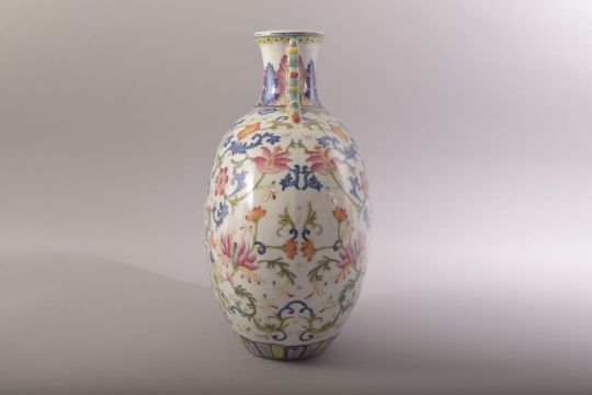 A CHINESE FAMILLE ROSE PORCELAIN TWIN HANDLE MOON FLASK, painted with an array of flowers and scrolling vine, the neck with two zoomorphic handles, six character mark to base, 30cm high.