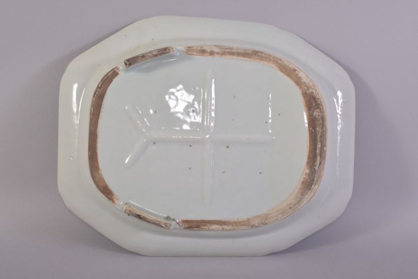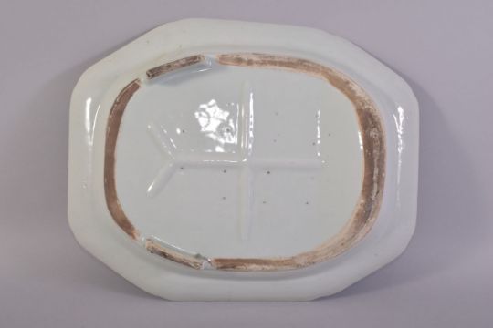 A CHINESE BLUE AND WHITE PORCELAIN CARVING DISH, decorated with landscape scene, the centre with fluted draining tree and well, 39cm x 31.5cm.