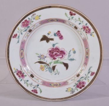 A CHINESE FAMILLE ROSE PORCELAIN PLATE, painted with flowers and a band of floral motifs, 22.5cm diameter.