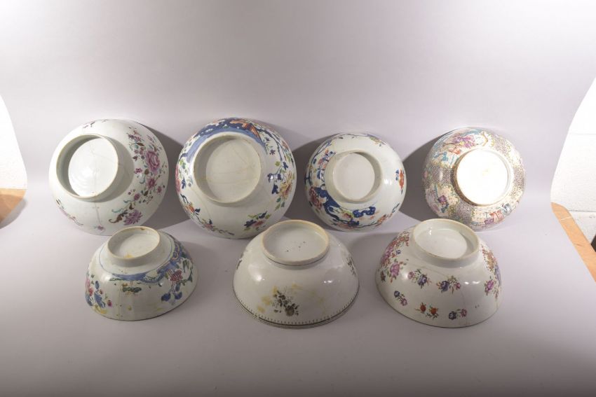 SEVEN LARGE CHINESE PORCELAIN BOWLS, various styles, six painted with native flora, one painted with panels of figures, (AF), various sizes, largest 28cm diameter (7).