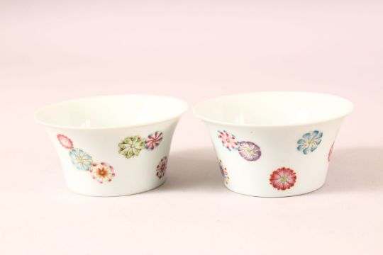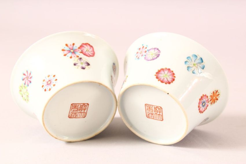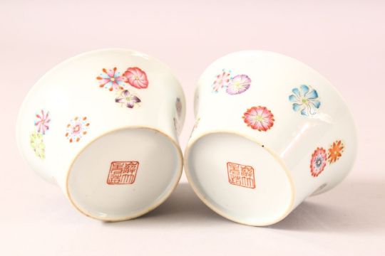 A PAIR OF CHINESE REPUBLIC STYLE FAMILLE ROSE PORCELAIN TEA CUPS, each decorated with floral roundel decoration, the bases with stamped four character marks, 9.5cm diameter.