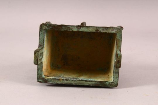 A CHINESE ARCHAIC STYLE TWIN HANDLE CENSER & STAND - with archaic beast decoration and a mark underside, the bronze alone:15cm x 12cm