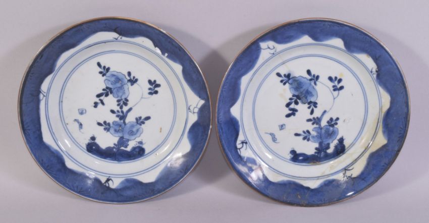 A PAIR OF CHINESE BLUE AND WHITE PORCELAIN DISHES, 21cm diameter, (af).