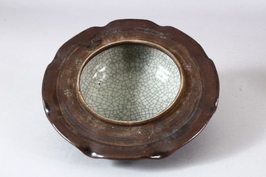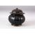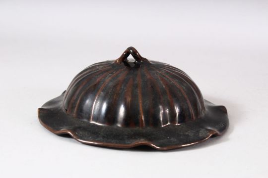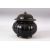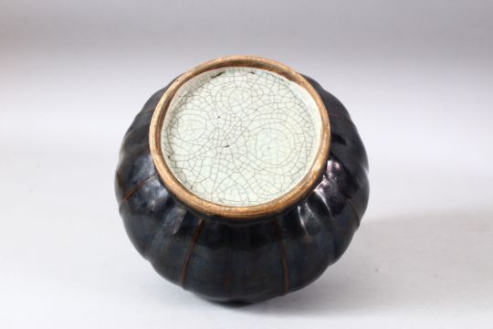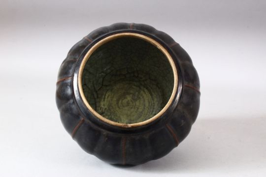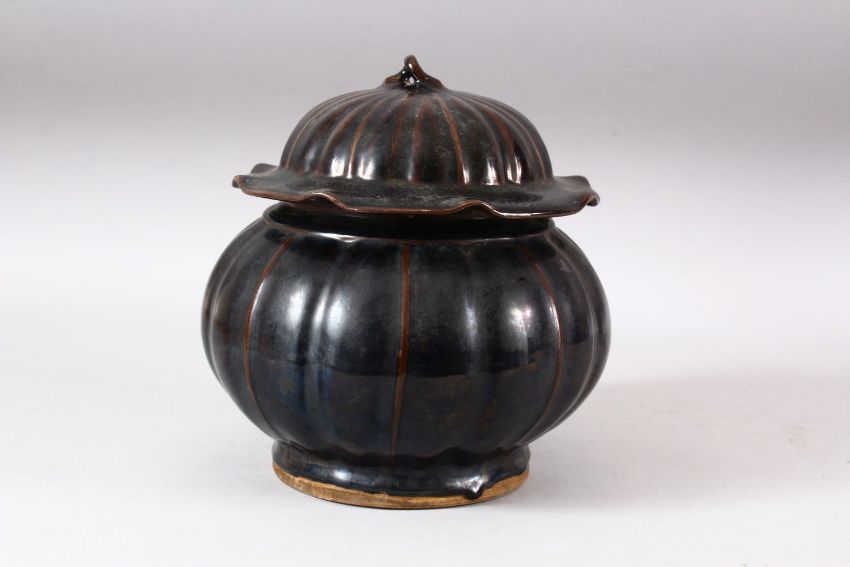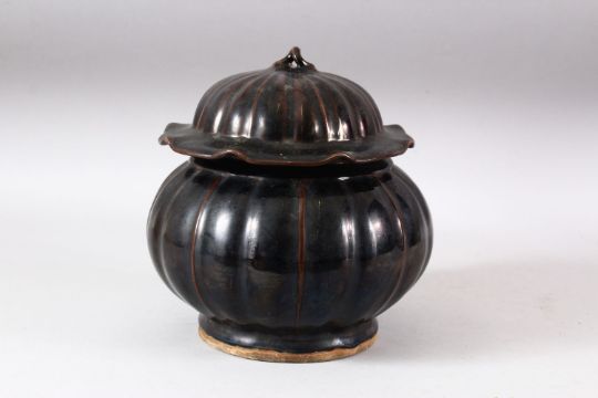 A CHINESE RIBBED BODY BROWN GLAZED JAR & COVER - the jar with a ribbed body, the cover with a twisted root finial, 22cm high
