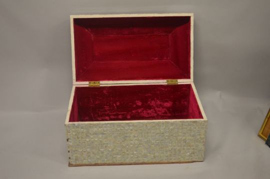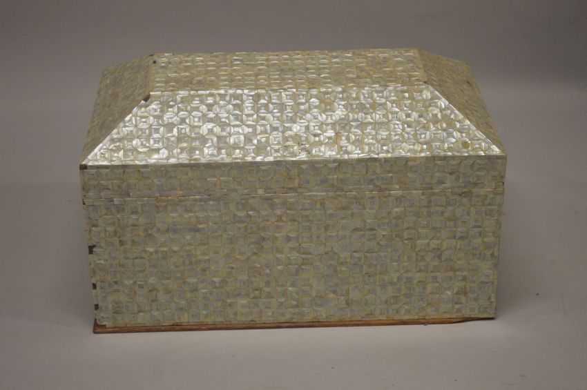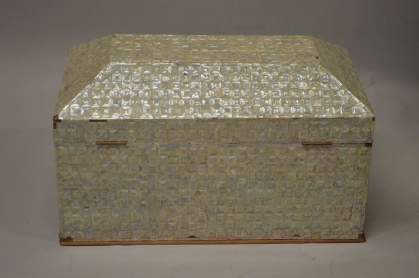 A LARGE INDIAN MOTHER OF PEARL VENEERED SARCOPHAGUS SHAPED COFFER, the hinged cover revealing a velvet lined interior, 82cm long, 46cm wide, 48cm high.