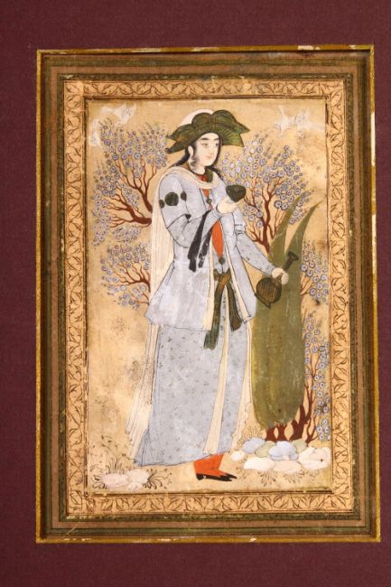 A LATE SAFAVID MINIATURE PAINTING OF A PRINCE, painted in a similar style to reza abbasi, mounted and framed, 35.5cm x 31cm.
