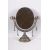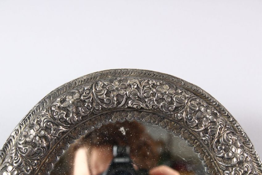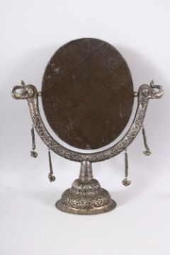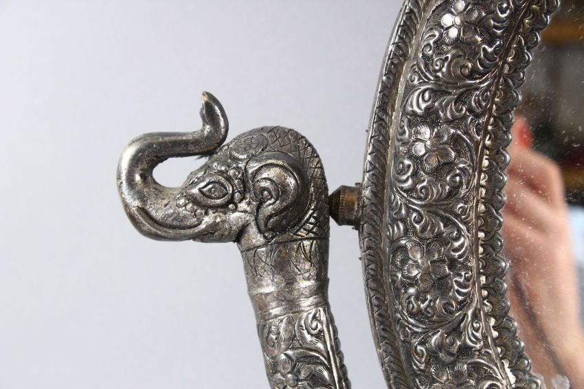 A GOOD INDIAN EMBOSSED WHITE METAL MIRROR ON STAND - the mirror with twin elephant heads eitherside of the oval mirror, the glass encapsulated with pressed floral metal, with hanging chain decor - 47cm