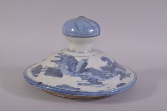 A LARGE CHINESE BLUE AND WHITE MING PORCELAIN URN COVER, inner rim diameter 15.5cm, overall 21cm diameter.