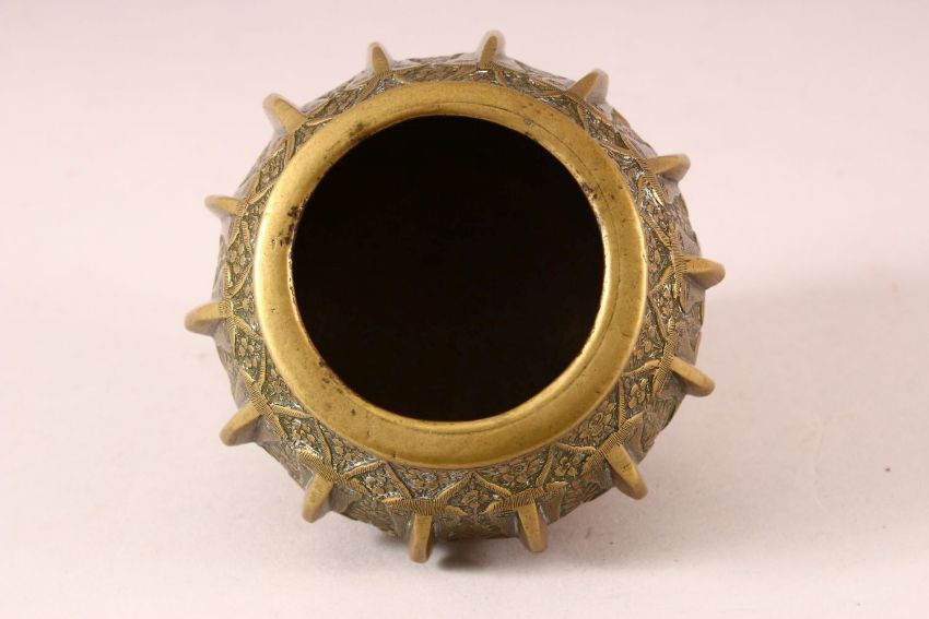 A 19TH CENTURY PERSIAN QAJAR ENGRAVED BRONZE MORTAR - with multi head decoration 12cm