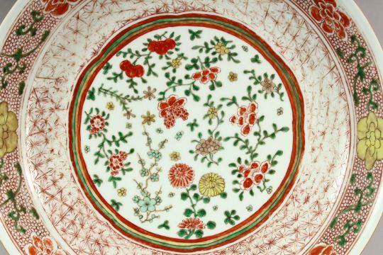 A VERY GOOD CHINESE FAMILLE ROSE CIRCULAR DISH, the centre with chrysanthemums and other flowers, 37cm diameter.