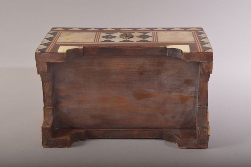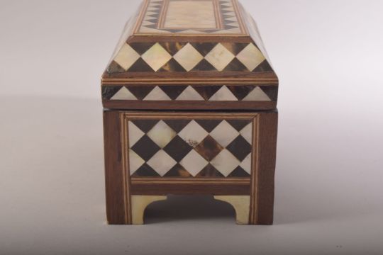 A TURKISH OTTOMAN ISLAMIC INLAID WRITING BOX, the box inlaid with mother of pearl and tortoiseshell, the hinged lid opening to reveal a small lidded compartment to the right, supported on four bracket feet, 22cm long.