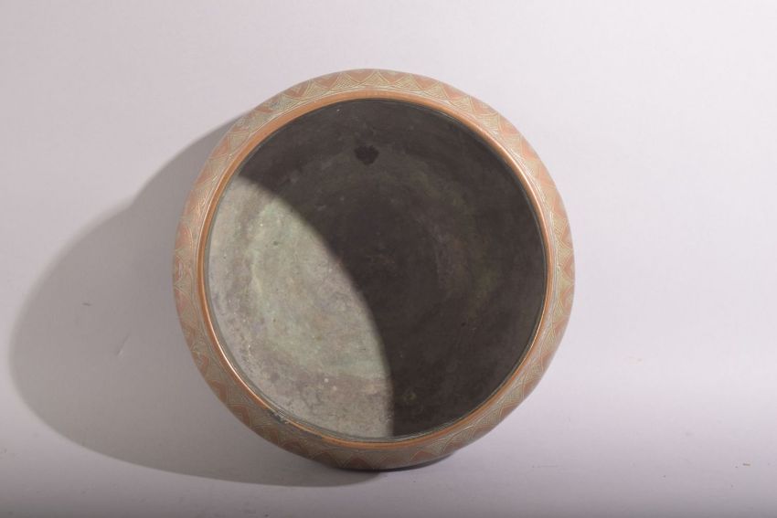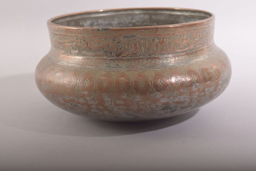 A GOOD ISLAMIC MAMLUK ENGRAVED AND CHASED COPPERED BRONZE BOWL, the rim with a band of calligraphy above stylised motifs, 19cm diameter.