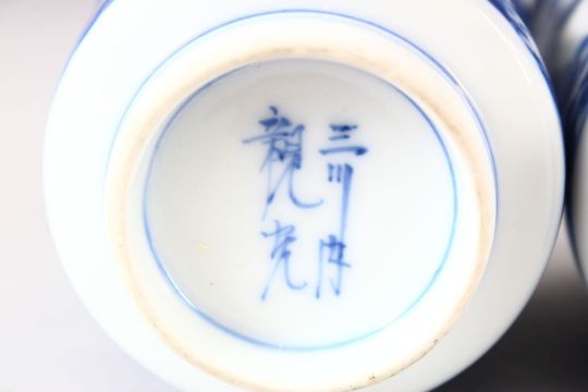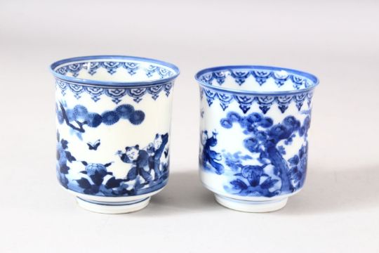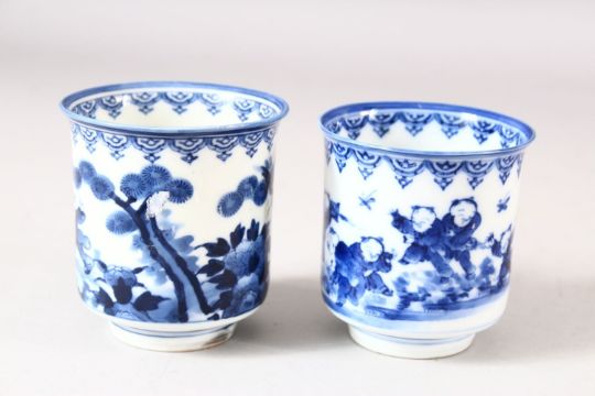 A NEAR PAIR OF JAPANESE BLUE AND WHITE PORCELAIN CUPS, decorated with boys in a landscape, 7.5cm and 8cm.