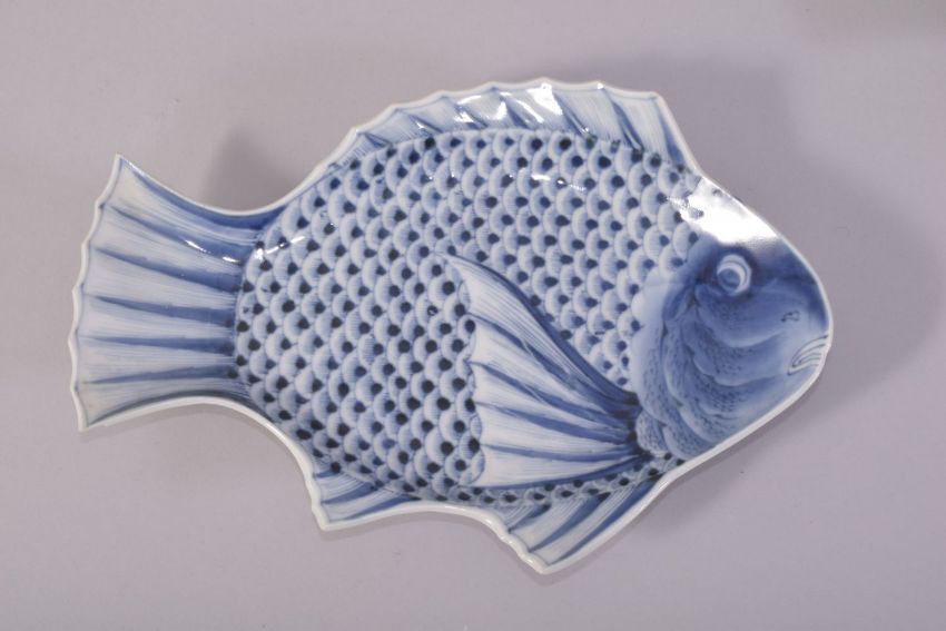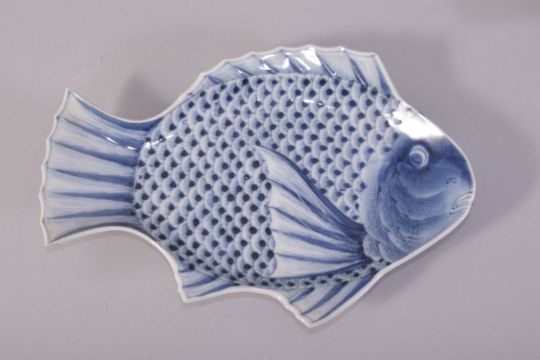 SIX CHINESE BLUE AND WHITE PORCELAIN FISH FORM DISHES, the dishes painted as fish, each dish with six character mark to base, each 25cm long.