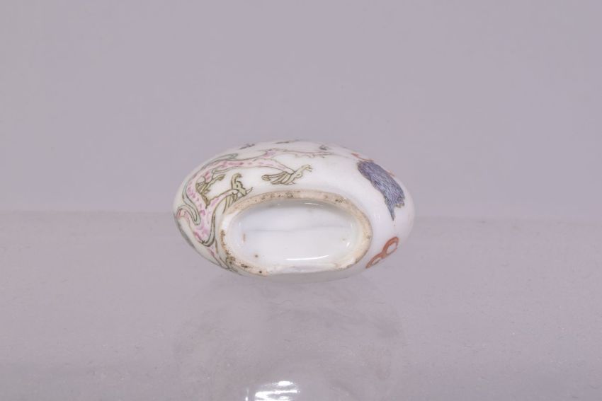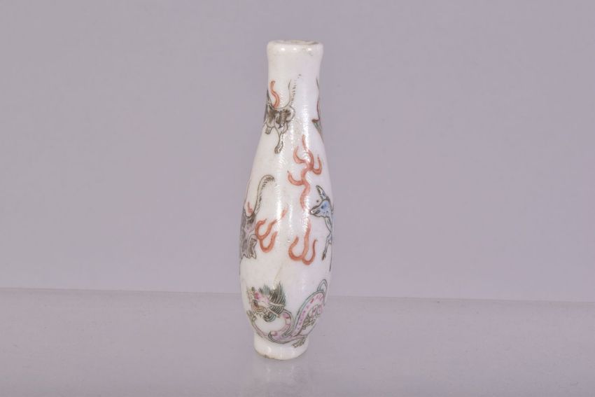 A SMALL CHINESE PORCELAIN SNUFF BOTTLE, painted with with mythical creatures, 6.5cm.
