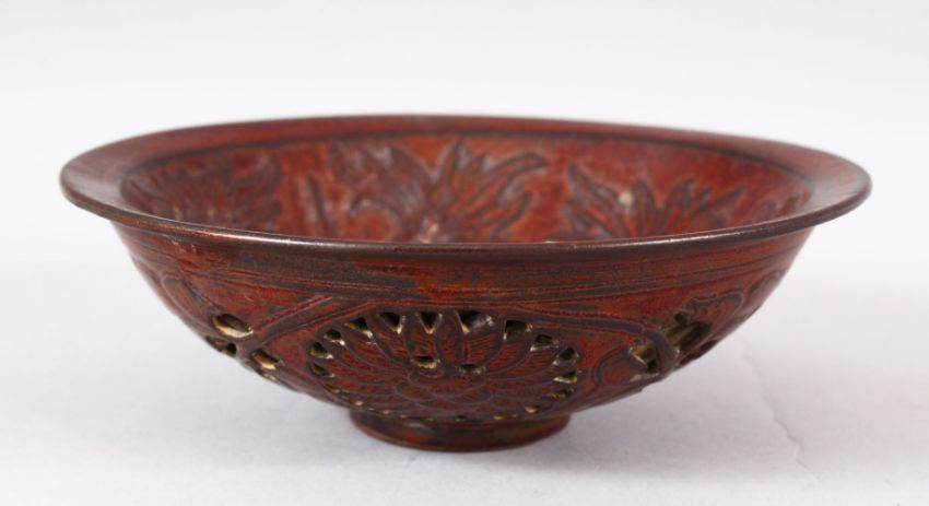 A CHINESE PIERCED POTTERY BOWL - the interior decorated with scenes of flora, the underside with pierced openwork style roundel's, 18cm