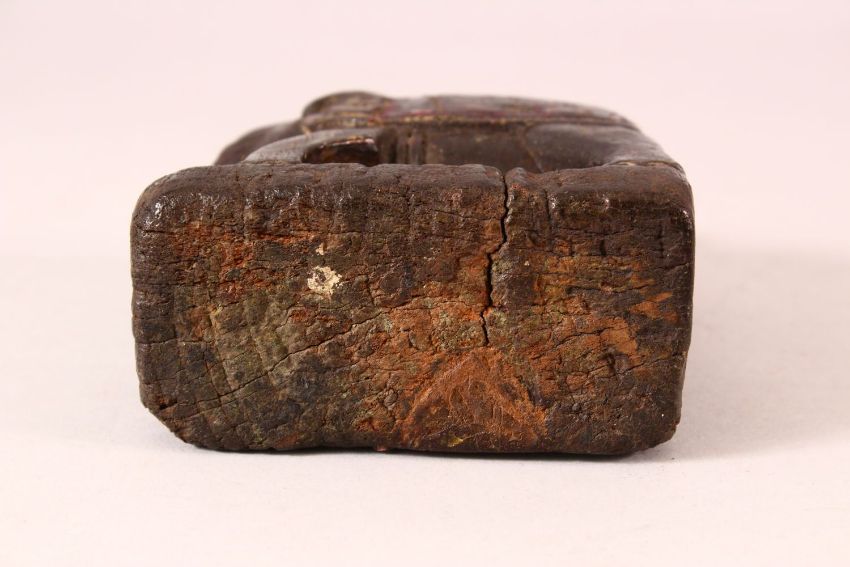 A 17TH CENTURY INDIAN CARVED WOOD FIGURE OF AN ELEPHANT, 14.5cm high.