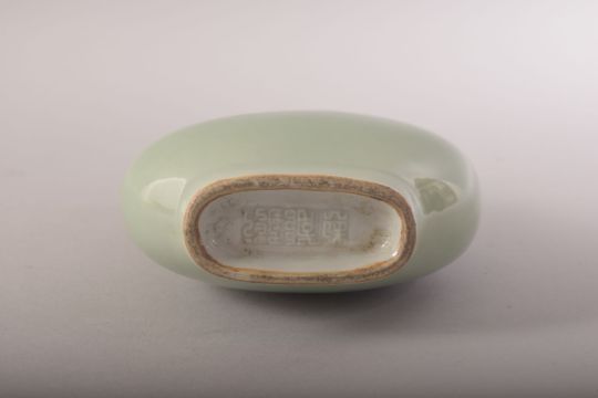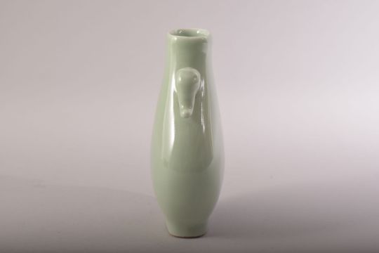 A SMALL CHINESE CELADON GLAZED VASE, with elephant formed handles, impressed mark to base, 15cm high.
