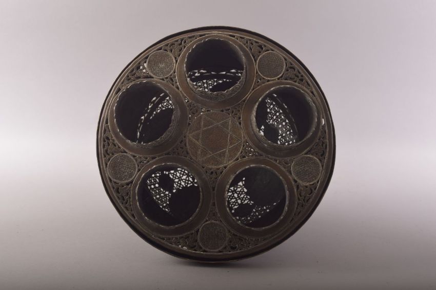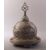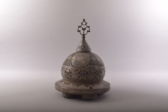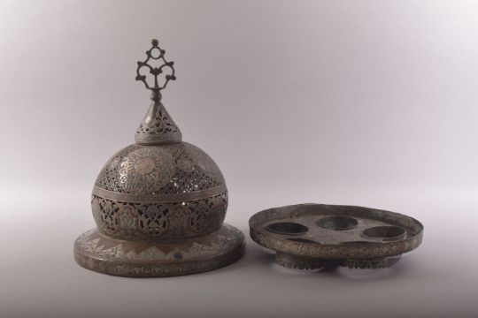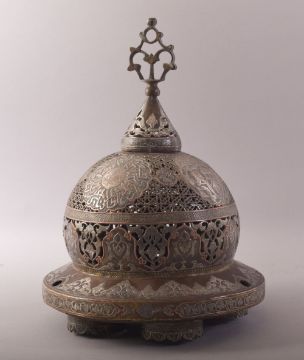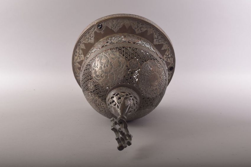A SUPERB ISLAMIC SILVER AND COPPER OVERLAID OPENWORK BRONZE MOSQUE LAMP, the cover opening to reveal five candle holders, the exterior decorated with roundels of silvered calligraphy and foliate motifs, 35cm high.