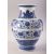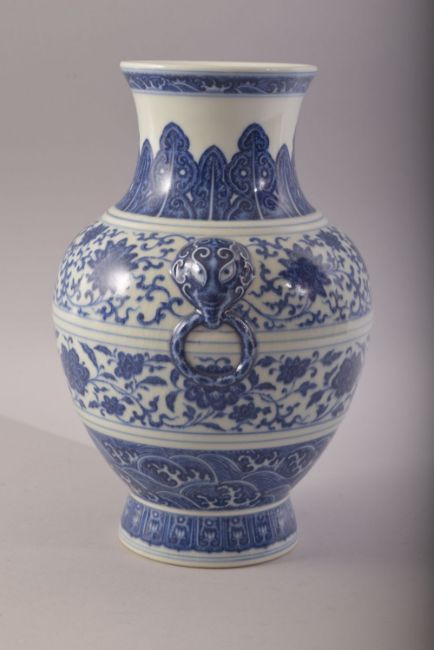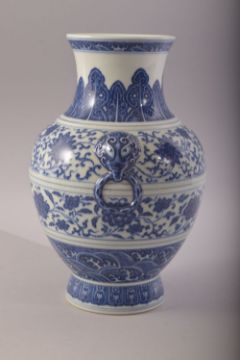 A GOOD CHINESE BLUE AND WHITE PORCELAIN VASE, with two shaped handles, decorated with flower heads and scrolling vine, six character mark to base, 26.5cm high.