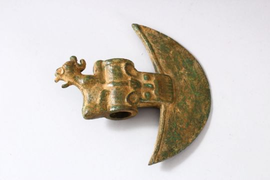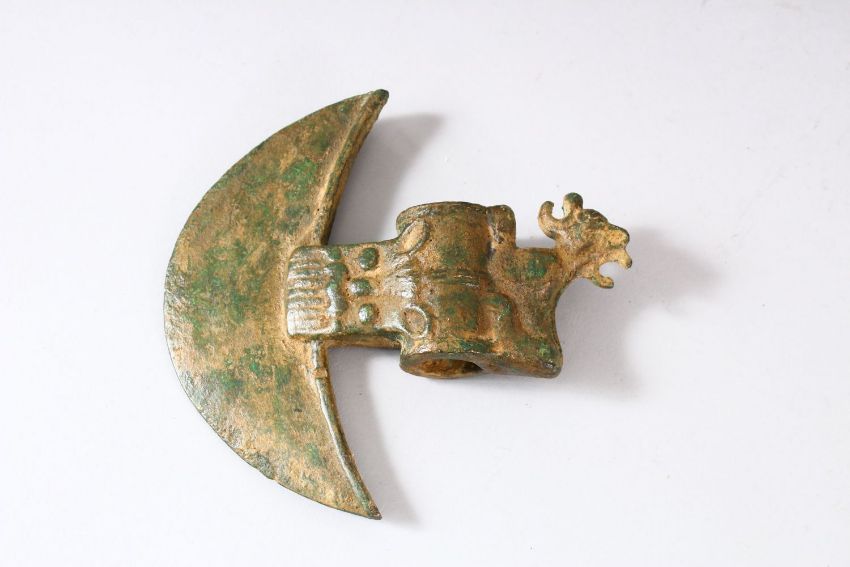 AN ARCHAIC STYLE BRONZE ZOOMORPHIC AXE HEAD on a wooden stand, the axe head, 15cm x 15.5cm.