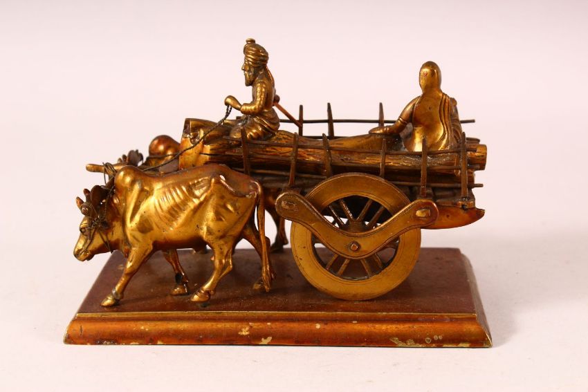 THREE 19TH CENTURY INDIAN METAL MODELS OF CARTS, each cart drawn by a variety of animals, largest 19cm long.