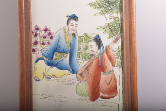 A CHINESE REPUBLIC STYLE PORCELAIN PLAQUE, in a wooden frame, with script upper left, 58cm x 19.5cm.