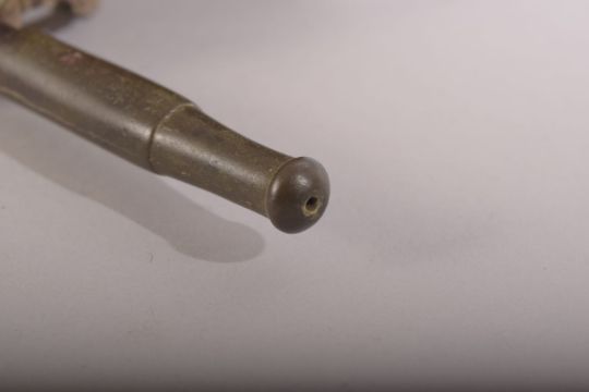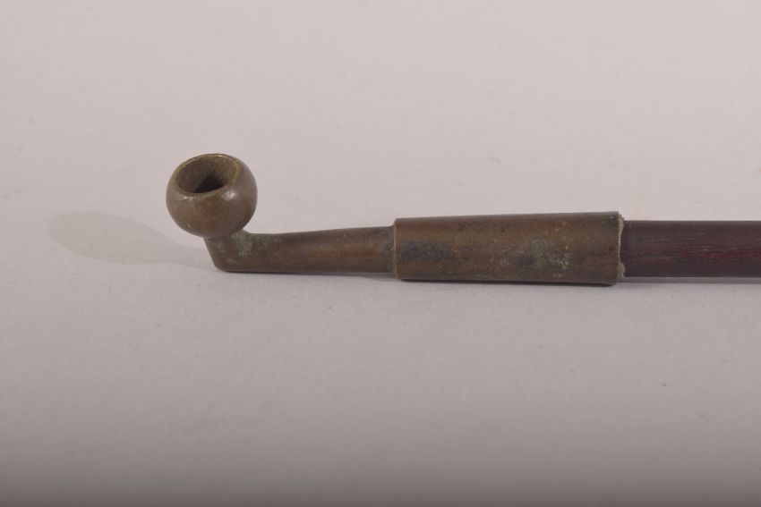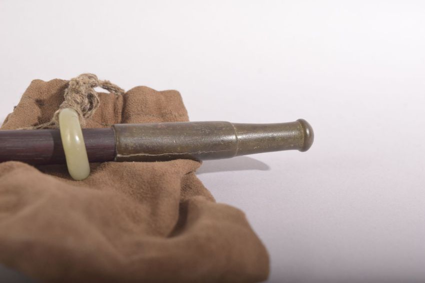 A 20TH CENTURY CHINESE SMOKING PIPE & JADE PENDANTS - the pipe with a jade ring holding a pouch with a carved cicada pendant - 43cm