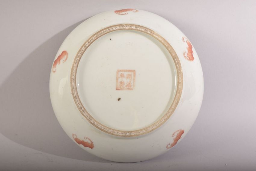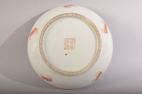 A CHINESE FAMILLE ROSE PORCELAIN BOX & COVER - depicting figures and children in landscapes - the underside with a red four character mark and bats - 18.5cm