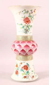 A GOOD TALL CHINESE FAMILLE ROSE GU SHAPE VASE, painted with flowers and birds, with bulbous central section formed as petals / scales, 49cm high.