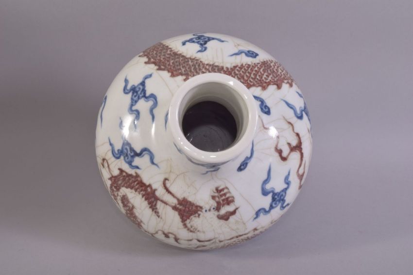 A CHINESE BLUE AND IRON RED PORCELAIN BULBOUS VASE, the body painted with dragon amongst stylised clouds, six character mark to neck, 28cm high.