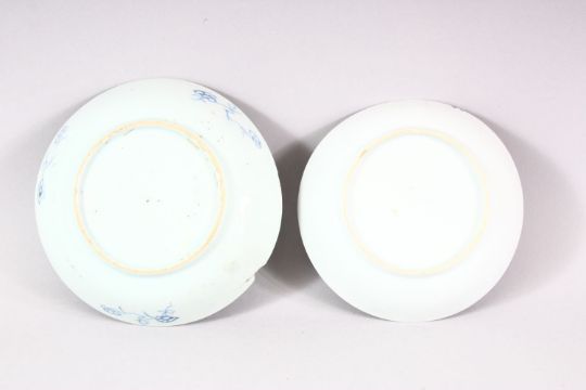 TWO 18TH CENTURY CHINESE FAMILLE ROSE / BLUE & WHITE PORCELAIN DISHES - the blue and white dish with lotus decoration 13.5cm, the famille rose with a floral bouquet display - 12.5cm