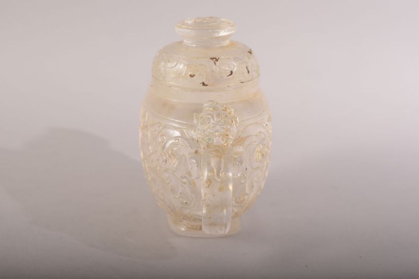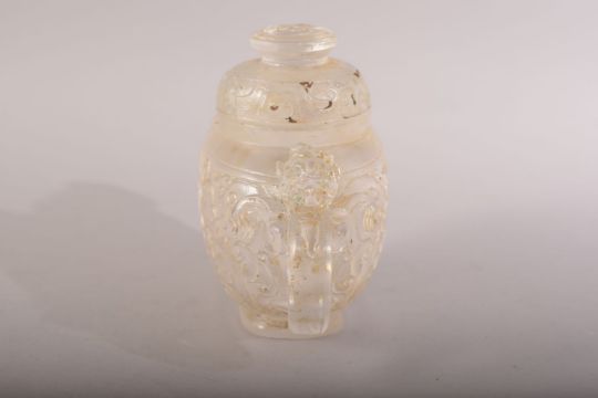A CHINESE CARVED / MOULDED GLASS TEAPOT & COVER - decorated with dragons and chilong - 14cm