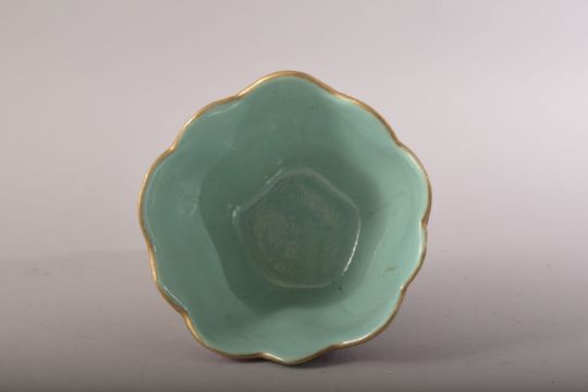 A CHINESE FAMILLE ROSE AND TURQUOISE GROUND PORCELAIN CUP, the cup with flower / petal form and with fine gilt highlights, six character mark to base, 10cm diameter.