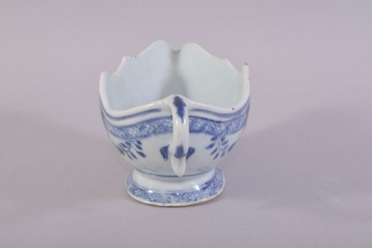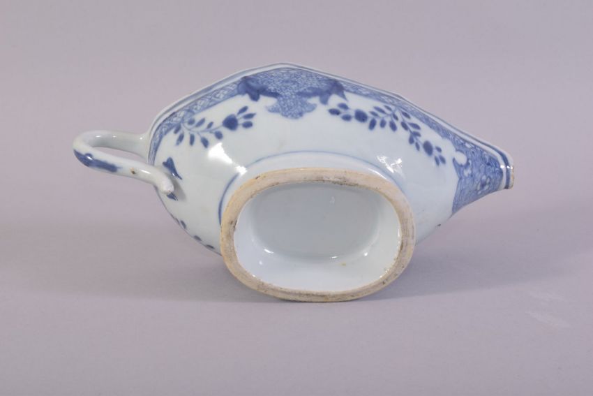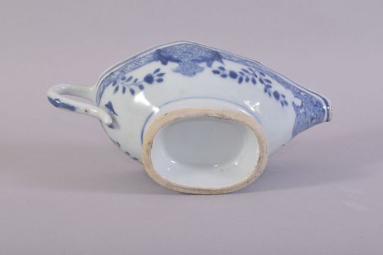 A CHINESE BLUE AND WHITE PORCELAIN SAUCE BOAT, the interior decorated with native flora, 21.5cm long.