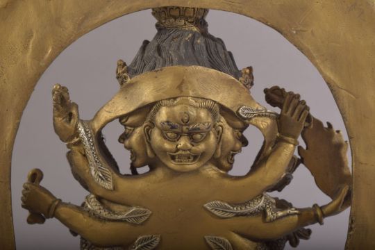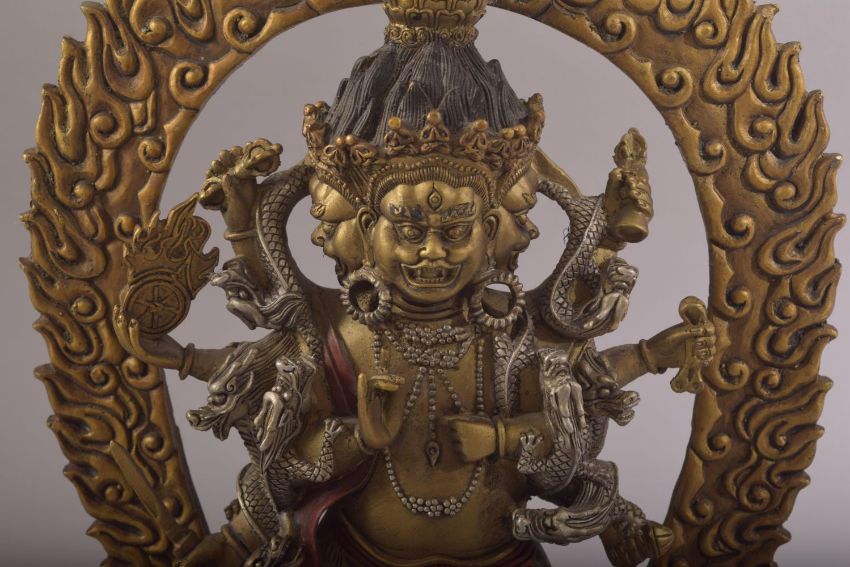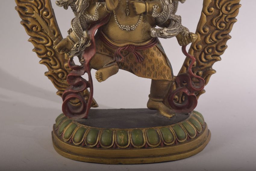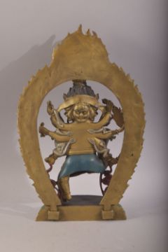 A TIBETAN GILT BRONZE FIGURE OF MULTI ARM BUDDHA- with poly chrome decorations, 32cm