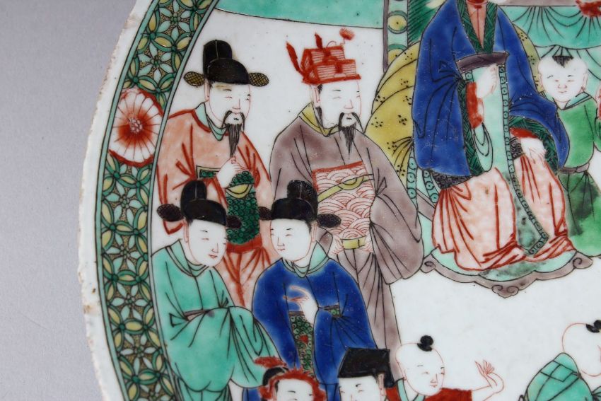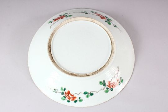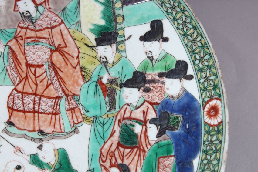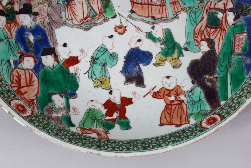 A LARGE FAMILLE VERTE PORCELAIN DISH, painted with figures and children in an interior setting, 33.5cm diameter.