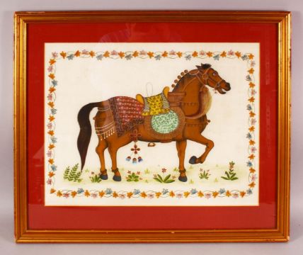 AN INDIAN PAINTING OF A HORSE ON SILK, with a floral border, framed and glazed, overall 55cm x 66cm.