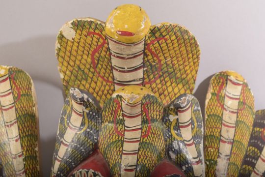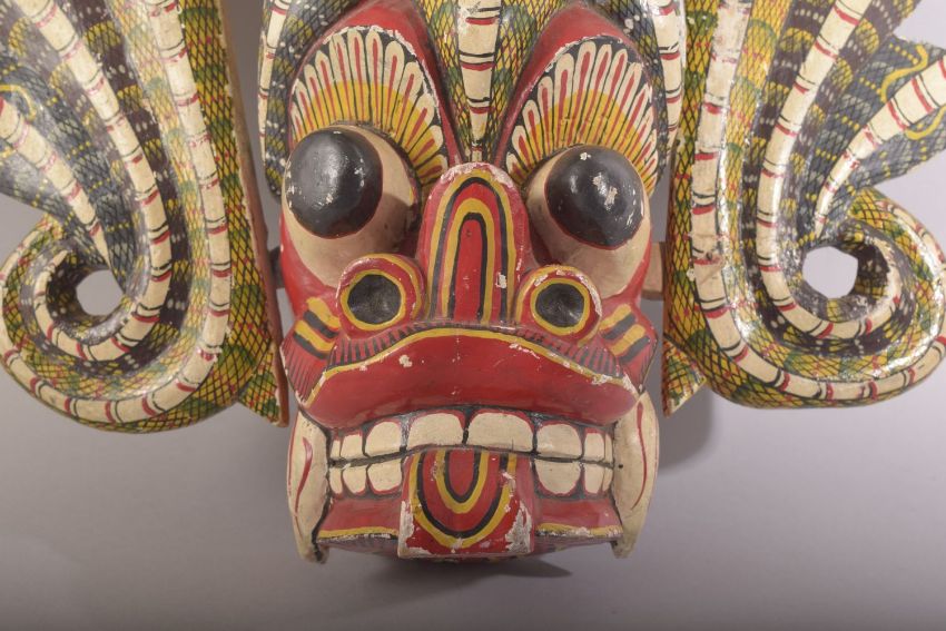 A LARGE SRI LANKAN CARVED AND PAINTED WOODEN MASK, 33cm x 45cm.